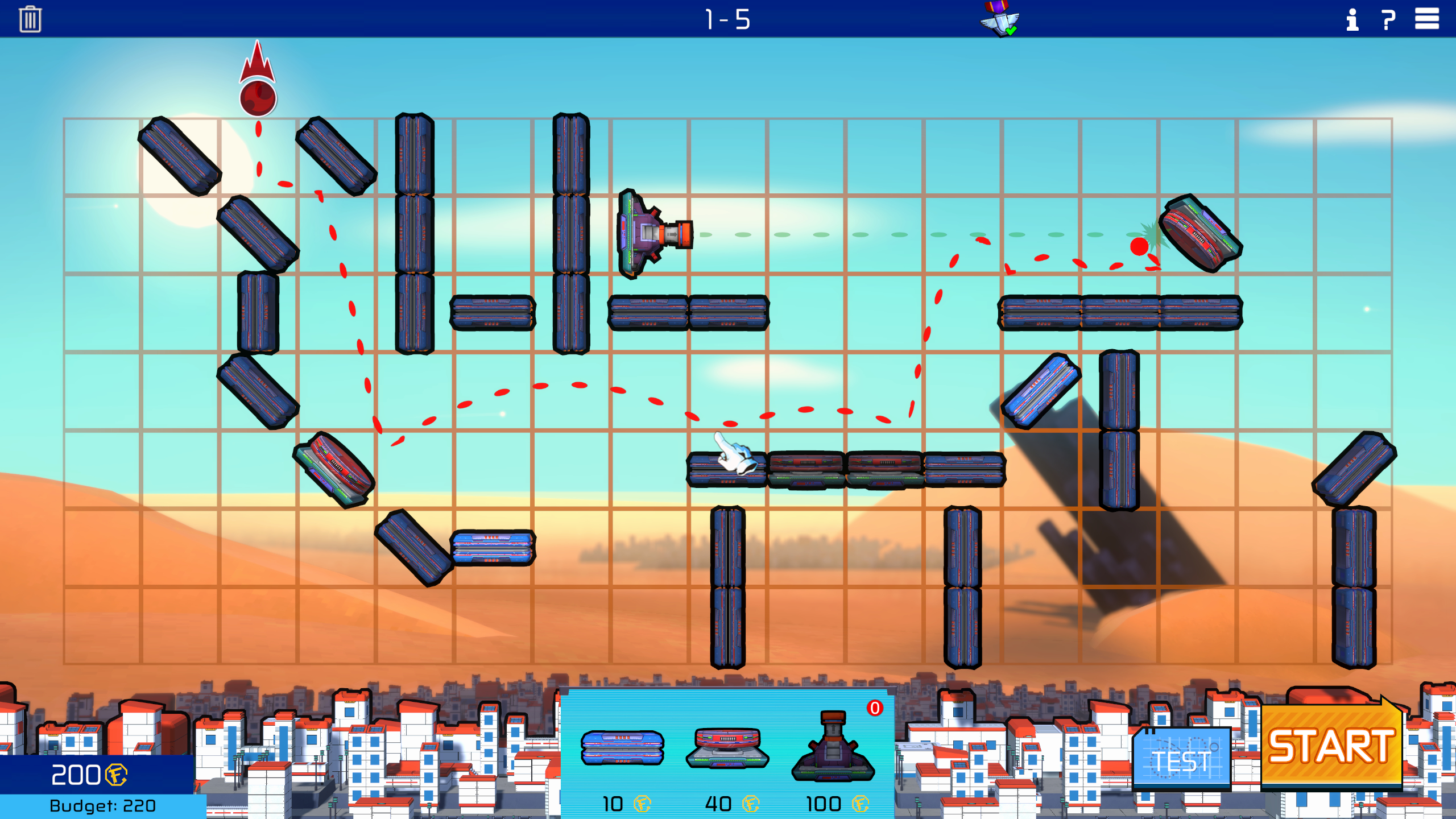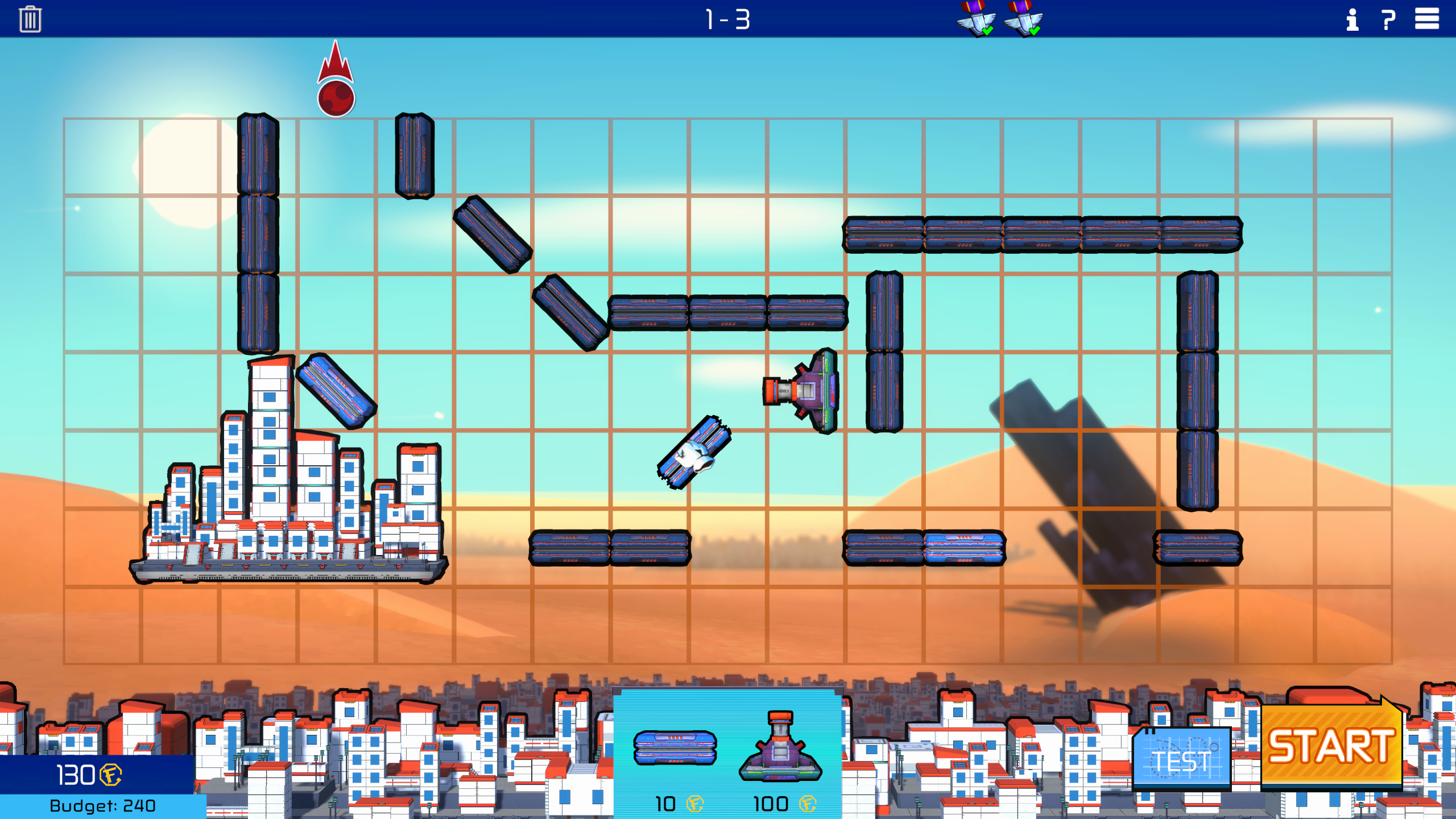 Do you think you can find a more efficient solution? Do not fret. You can iterate between different designs really fast. You can add, destroy, or move your defense buildings endlessly and without cost. And if your head is not on the game at the moment, your solution will be saved, so you can always come back later and tinker with it again.